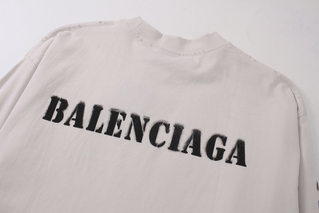 BALENCIAGA 模糊字母LOGO印花成衣磨爛長袖T (白)